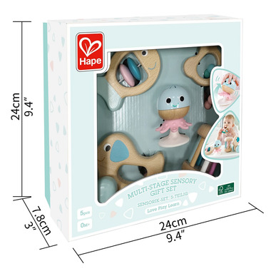 - Includes one fish rattle, one beads teether, one stay put rattle, one rolling rattle and one dog on wheels