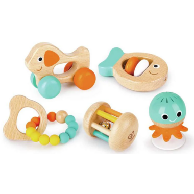This wonderful collection of toys grows with your little ones and helps their development every step of the way. Featuring rattles and chewy teething beads for babies, a stay put rattle for when they're big enough for the table, and rolling crawler puppy and rattles for when they grow into toddlers!