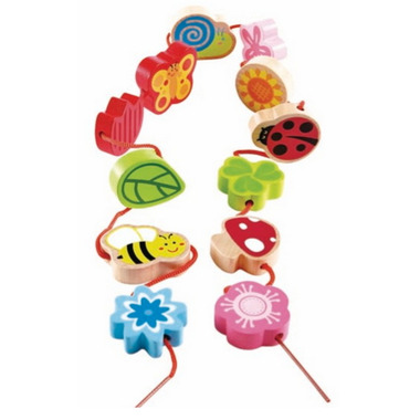 Spring themed pastel colored shaped cubes. String it together to promote coordination. Endless ways to play; arrange different sequences, name the images, colors and shapes.
