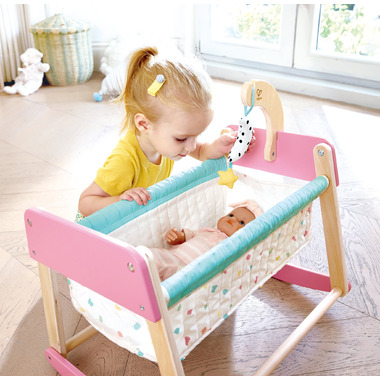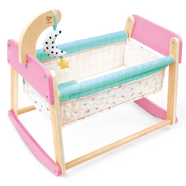A wooden cradle that gently rocks dolls to sleep. Includes a detachable fabric bassinet and cute hanging decorations.