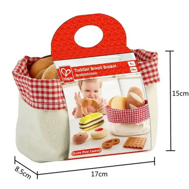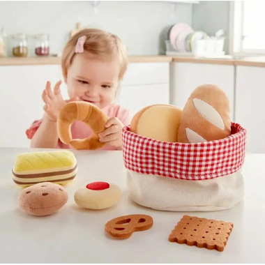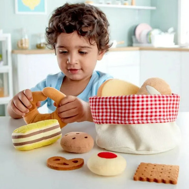 Fill your basket with a whole bakery of bread for you and your friends! Includes one piece of toast, one baguette, one croissant, one choc chip cookie, one soda biscuit, one jam cookie, one heart-shaped butter cookie and one piece of layer cake! Made from felt and fabrics which have a soft, realistic texture.