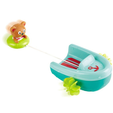 Make bath time fun with this splendid speedboat, complete with a tubing bear! Pull the back on his string and the boat will actually move through the water, pulling the bear behind on a tube until he reaches the boat safely.