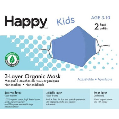 Happy Kids Organic Comfort Masks are a 3 layer mask made with sustainably cultivated 100% organic cotton with a built-in filter. Soft adjustable ear loops with stoppers for a secure and comfortable fit. For kids age 3- 10 years.