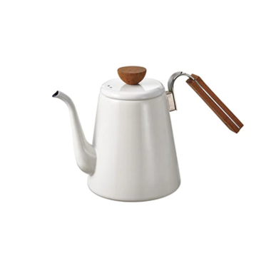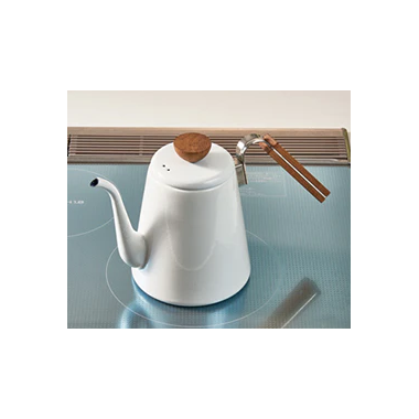 A traditional enamel tea kettle with substantial weight and an ergonomically designed handle that allows you to pour with ease. This kettle is equipped with many features that will make your tea experience noticeably better such as a wide pour spout (allows more air to be present in the water you are pouring resulting in "jumping of the leaves" which is essential in good tea brewing), a built in flow restrictor and the benefits of an enamel pot (steel coated in glass giving you nice aesthetics along with the absence of a metal taste). Can be used on any heat surface including induction!
