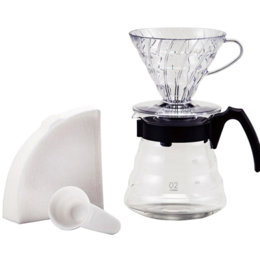 If you're looking to get started with coffee brewing, or know someone you'd like to get started with manual brewing (and maybe they have a birthday coming up), then this Hario starter set was made for you. This great value boxed set comes with a Hario V60-02 Clear Coffee Dripper, a Hario V60-02 Diner Coffee Server, and a 40-pack of white V60-02 filters. Oh, and there's a coffee measuring spoon so you don't even need to buy a scale... yet.
