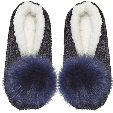 Cozy as your favourite blanket these slippers have a sweater-like knit exterior. Super soft and plush on the inside. Fun stylish navy pom pom.