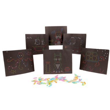 Includes 100 Pegs, 8 Templates (Size 20.32Cm Wide X 17.15Cm High). Templates are reuseable and include letters of the coloured peg to be inserted. Compatable with standard size Lite Brite. Ages 4+.
