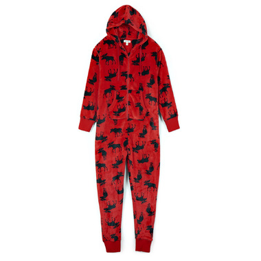 Hatley Adult Hooded Fleece Jumpsuit Moose on Red