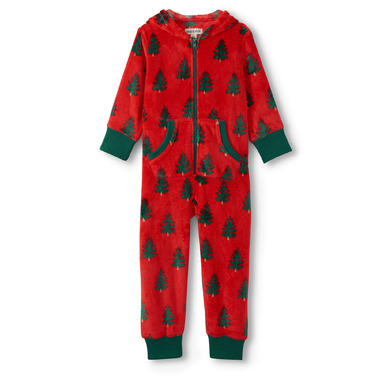 Hatley Little Blue House Kids Hooded Fleece Jumpsuit Trees On Red
