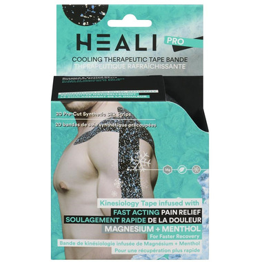 Heali PRO Kinesiology Tape infused with Magnesium and Menthol can help to prevent, stabilize and treat many conditions. It can help relieve: headaches, neck pain, shoulder pain, tennis elbow, golfer’s elbow, wrist injuries, tendinitis, tenosynovitis, mid back pain, low back pain, ITB pain, quad pain, strains (ie-hamstring), calf tightness, shin splints, heal and foot pain, planter fasciitis, etc.