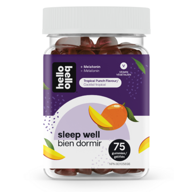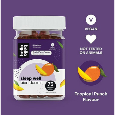 Give your body clock a bedtime using melatonin and some of Mother Natures best sleep-promoting plants: lemon balm and passionflower. It's a nightly lullaby that will remind you to put down the phone because your pillow is calling. Hello Bello Sleep Well vitamins are vegan, made with organic ingredients, and made WITHOUT artificial flavours or colours, high fructose corn syrup, common allergens (wheat, gluten, eggs, peanuts), artificial preservatives or gelatin. Yummy tropical punch flavour.