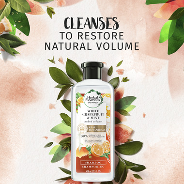 Gently volumize flat, fine hair with Herbal Essences White Grapefruit & Mint Shampoo. Real botanicals are endorsed by Royal Botanic Gardens, Kew, a leading expert on plants. This shampoo, with real botanicals, cleans and volumizes hair from root to tip.