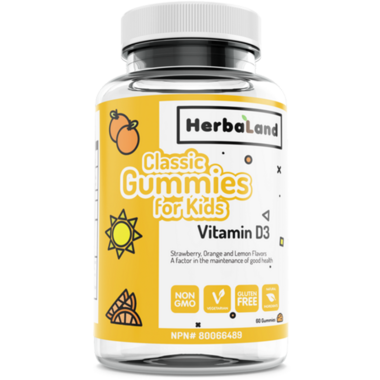 Vitamin D is essential for the maintenance of overall good health. In particular, Vitamin D plays a key role in bone health and in the absorption of calcium and phosphorus, which are required for the development and maintenance of strong bones and teeth. Vitamin D also helps support the immune system and the cardiovascular system. Herbaland Classic Gummy for Kids: Vitamin D is a highly potent formula that provides all health benefits of this vitamin in one juicy serving of fruit-flavored vegetarian gummy.