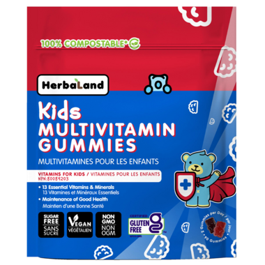 Now in 100% compostable Packaging. Multivitamins gummies for kids are Herbaland's most advanced multi-vitamins and minerals formula yet with natural vitamin E from sunflowers and the most bio-available form of vitamin B12. These delicious gummies are made with a new plant based, organic and sugar-free formula!