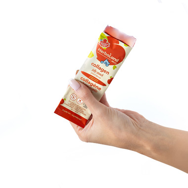 Snack-sized skincare. Herbaland's Collagen Jelly Stick is a convenient beauty snack made with 1g of marine-sourced collagen, 1g of sugar, and 100mg of organic cranberry powder to support your skin from within as part of a balanced diet.