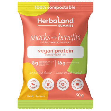 Herbaland's mango papaya-flavored vegan protein gummies are an easy and delicious on-the-go snack. Each pouch is packed with nutrient-dense superfoods, protein, and fiber to provide an all-around snack for any occasion.