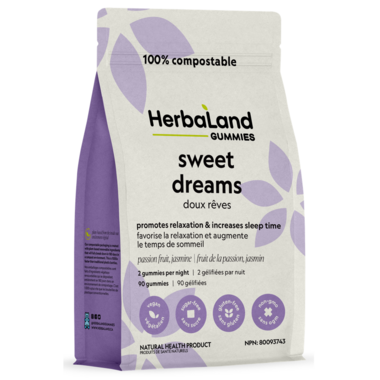 Herbaland Sweet Dreams Gummy for Adults is just the thing for restless nights. More than just melatonin, it is formulated with L-theanine, a unique amino acid derived from green tea that has been shown to stimulate calmness and help the body cope with stress. It also contains Vitamin B6 and lemon balm extract to help maintain sleep quality and to reset the body’s sleep-wake cycle.