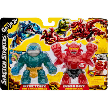 Introducing the NEW Heroes of Goo Jit Zu Stretch Strikers Versus Packs! Prepare for an all-out battle as fan favorite hero Sir Thrashalot duels the evil villain Barbarian Redback! Each warrior is equipped with the ability to stretch up to three times their size, creating an EPIC Stretch Attack showdown! They also have a unique goo filling. Squeeze and stretch their bodies to discover it! Who will come out victorious? Will Sir Thrashalot's EPIC stretch attack be too strong for Barbarian Redback? The stage is set; add to the battle by collecting all of the stretch strikers to create the ULTIMATE, EPIC stretchy clash between good and evil!
