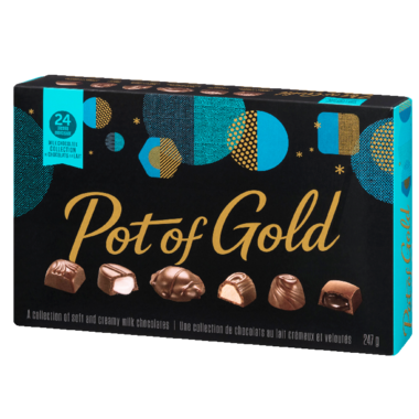 Treat friends and family to a soft and creamy assortment of milk chocolates. Hershey's Pot Of Gold Milk Chocolate Collection contains 24 pieces of vanilla caramel, strawberry, pecan caramel, vanilla cream, truffle, and chocolate caramel confections in milk chocolate.