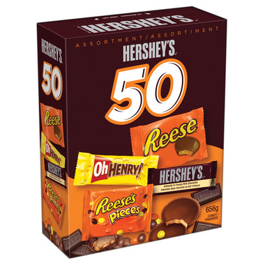 Be ready to hand out treats with this variety of Hershey's favourites: Hershey's Almonds in Creamy Milk Chocolate, Reese's Pieces, Reese Peanut Butter Cups, and Oh Henry!