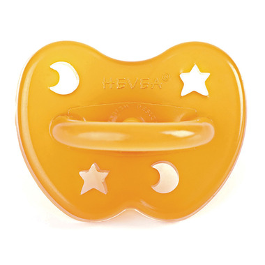 This 100% natural rubber pacifier has a great star and moon design that is perfect for both boys and girls. The pacifier comes in a stylish brown and beige wrapping.  Nipple shape is orthodontic. The Hevea pacifier is made of 100% pure natural rubber from the rubber tree Hevea brasiliensis.