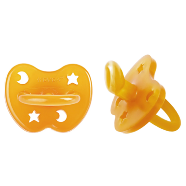 This two-pack of HEVEA 100% Natural Rubber Pacifiers is perfect for babies and toddlers from 3 to 36 months. HEVEA pacifiers feature a seamless one-piece build that makes them easy to clean and hygienic. The natural rubber teat and face ensure the pacifier is soft to touch and gentle on your baby's face and lips. And the fun cut out shapes on the face ensure your babys safety while also having some adorable fun! And like all HEVEA baby products, 100% natural rubber pacifiers are eco-friendly and safe for both your baby and the planet.