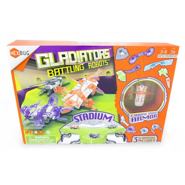 Race into battle using vibration propulsion technology with the HEXBUG Gladiators Battling Robots Stadium! Formulate a winning strategy while building a combatant of your own design, using custom kinetic armor and weaponry. Enter the tri-lobe stadium and go head to head against the competition, where only one will walk away victorious! Deluxe playset includes exclusive bonus armor!