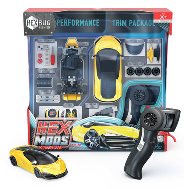 HEXMODS Pro Series Elite includes a car chassis capable of speeds of up to 20 feet per second - that's 13 mph! Each kit comes ready for full modification. This set comes with a body kit so you can swap out hood, spoilers,and an alternate set of rims . Performance can be upgraded too; changing suspension, tires with different grip levels, gears for tuning to adjust speeds are included to provide total customization. Then personalize your car with decals to separate yourself from the pack. Each HEXMODS tuner car is also equipped with LED powered underglow for lighting up any circuit or track! Comes with a 2.4 GHz remote for top level steering and play.