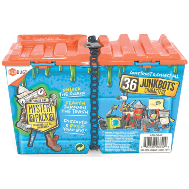 The universal socket system allows you to take apart the Junk Bots and reattach pieces together to create totally unique figures. The more you collect, the more options you have in building your own creation! When your figure is built, the trash-can-packaging doubles as a display stand.