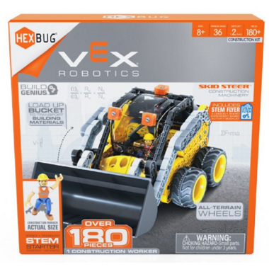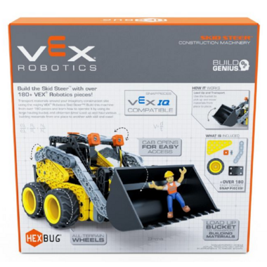 Get moving with the VEX Robotics Skid Steer by HEXBUG! This mobile mover is designed with STEM in mind to help keep the workflow moving by hauling or lifting objects around your VEX Construction site. The Skid Steer is made of 180 easy-to-snap-together VEX IQ pieces, allowing for quick, easy build adjustments! This construction is easy with the step-by-step illustrated instructions! This Skid Steer is complete with a working arm and bucket for lifting dirt and other objects around the area! Also included is a miniature construction worker figurine and STEM experiment guide and parent sheet to extend your learning!