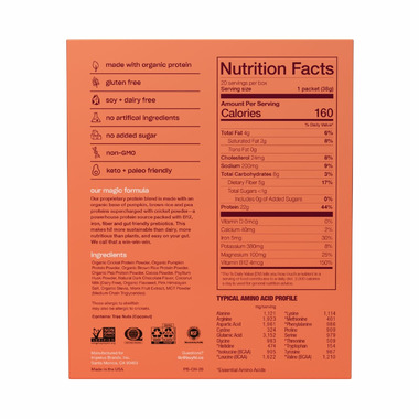 - GREAT TASTING: 22 grams of a premium, organic base of pumpkin, brown rice and pea proteins supercharged with cricket powder ֖ a powerhouse protein source packed with B12, iron, fiber (5g) and gut boosting prebiotics with a complete amino acid profile