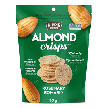 Hippie Snacks Almond Crisps Rosemary flavour. Minimally processed. Non-GMO.