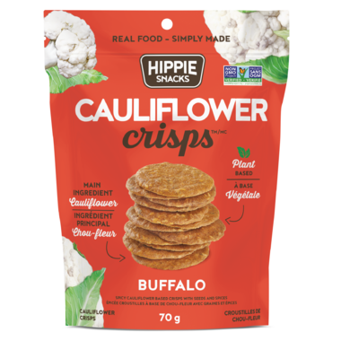 Hippie Snacks Cauliflower Crisps Buffalo flavour. Spicy Cauliflower based crisps with seeds and spices. Plant-based, Non-GMO.