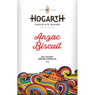 Hogarth grounds rolled oats into chocolate, along with dark brown sugar & salty butter to give it the oaty, buttery, golden syrup-y flavour, then added pieces of coconut into the bar to mimic the coconut of the ANZAC Biscuit. The flavour is instantly recognizable as a Kiwi favorite, the ANZAC Biscuit....with chocolate.