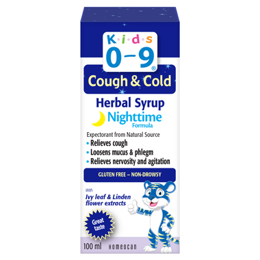 Kids 0-9 Cough and Cold Herbal Nighttime Syrup with Ivy leaf and Linden flower extracts.