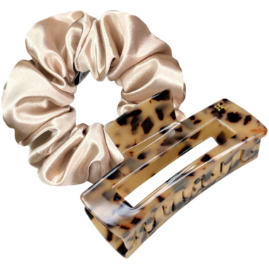 Elevate your hair routine with HoneyLux's essential bundle, featuring the Pure Silk Scrunchie and the XL Claw Clip - a perfect duo for everyday luxury and effortless styling.