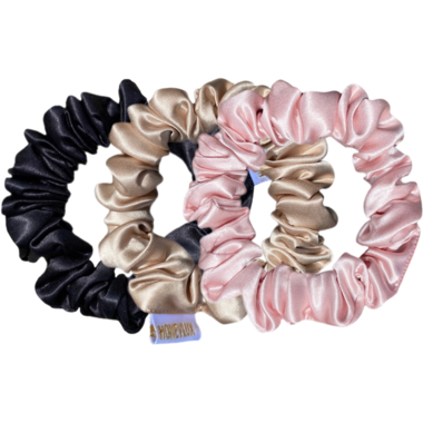 This set includes three luxurious mini scrunchies in classic Black, Pink, and Champagne.