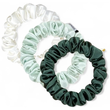 You get: 3 100% silk mini scrunchies in white, sage, and pine. The perfect accessory for the holiday season!