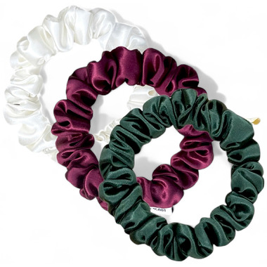 You get: 3 100% silk mini scrunchies in white, burgundy, and pine the perfect accessory for the holiday season.