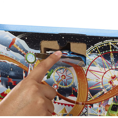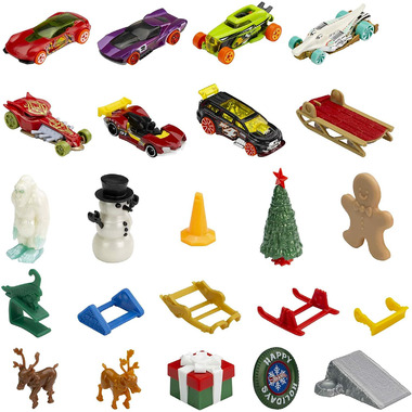 This advent calendar includes eight 1:64 scale Hot Wheels cars and 16 accessories that inspire wintery adventures. The box itself is part of the fun with an attached playmat for use with the new treasures. Vehicles and accessories may not work with all Hot Wheels sets.