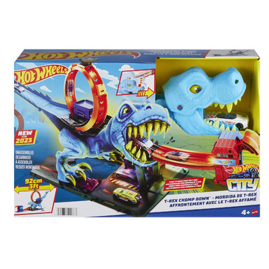 Knock out the dinosaur and save the day in the Hot Wheels City T-Rex Chomp-Down Playset. It features a slam launcher and 9-inch loop where kids launch their Hot Wheel cars just right to defeat the beast. When the dino gets knocked out, its eyes transition from angry yellow to knock-out X-es. Includes one Hot Wheels vehicle and connects to other sets. It's geared toward kids 4 years old and up. Colors and decorations may vary.