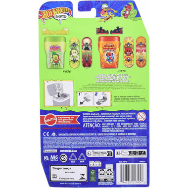 Take boards on the go with the Hot Wheels Skate Flavor Container that holds and hides 2 fully assembled fingerboards and a pair of skate shoes in a chewing gum-like container! Pop open a "flavor" like "Bubble Blast" or "Snakeberry Sour" that's decorated with sweet graphics and resembles packs of gum. Inside, there are 2 exclusive boards and a pair of removable skate shoes with matching graphics and colors. These compact containers make it easy and cool to skate anywhere! With multiple "flavors" available, skate fans will want to collect them all. Each sold separately, subject to availability. Colors and decorations may vary.