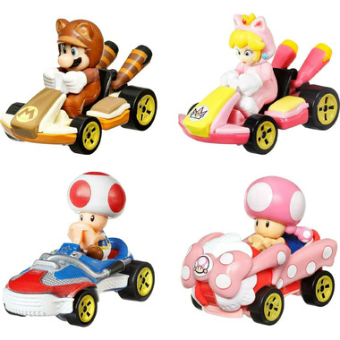 Includes: 4 x 1:64 scale Hot Wheels Mario Kart vehicles. Tanooki Mario, Cat Peach, Toad & Toadette.