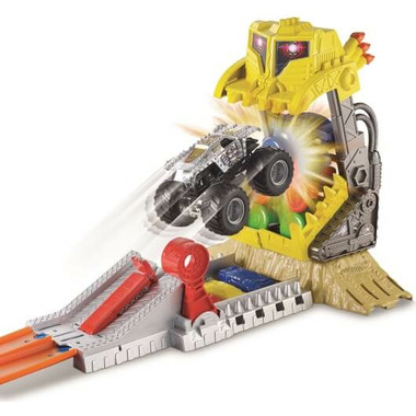 Complete a front flip by flipping the switch on the ramp for front flipping action! Launch the Max-D™ monster truck and jump through Crush Dozer's jaws to release them or adjust the front flip higher and take down the Crush Dozer for good. The crowd roars and its unstoppable Monster Jam™ action when you recreate the EPIC front flip that the real Max-D™ performed to win the Guinness World Record title!