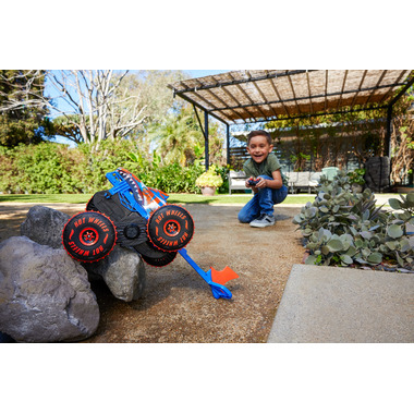 The Hot Wheels Monster Trucks Tiger Shark Climber RC is ready to smash, crash and climb! It features multi-terrain capabilities with an innovative tail that helps the beast climb over obstacles and the competition. In speeder mode, it plows over assorted surfaces thanks to its Grip Action Tires. Enter climber mode to extend its tail and have Tiger Shark scale obstructions like a champ. Push a button on the remote to send it spinning into a frenzy, showing off its speed and style. Colors and decorations may vary.