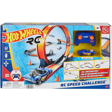 The Hot Wheels RC Speed Challenge track set features 30+ track pieces and a Hot Wheels remote-control car for the ultimate in racing and stunting. Design an epic race course with twists and turns or build one for high-speed stunting with an awesome loop. Test it out with the included 1:64 scale remote-control vehicle that can race and stunt on and off Hot Wheels tracks. The set inspires open-ended play, creativity, unlimited racing and wild stunting. Colors and decorations may vary.