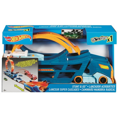 The Stunt & Go Mobile play set is totally portable for stunting action anywhere, anytime! Fold the entire play set back up, load your cars in the truck bed and roll off until your next Hot Wheels stunt show.