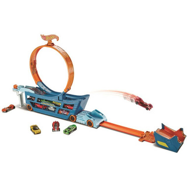 This awesome rig holds up to 19 cars, but look again, this is no ordinary hauler, this is a MOBILE PLAYSET- the first ever hauler with a loop! Snap the two sides of the loop in place and swing out the collapsible launcher, then pull the cab at the front to create a dramatic jump. Launch through the loop and land the jump over and over again, or add additional track for an even longer jump.