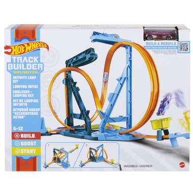 The Hot Wheels Track Builder Unlimited Infinity Loop Kit transforms a standard loop into two thrilling and challenging set-ups that invites kids to experiment with momentum in visually exciting ways! The stand launcher sends cars speeding into the infinity loop and then onto an exit track with a jump that flips vehicles into the catch cup.