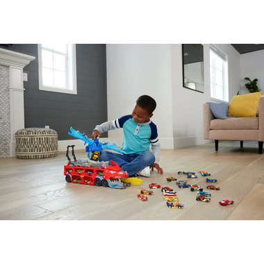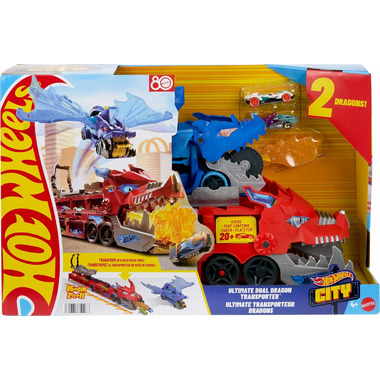 The Hot Wheels Ultimate Dual Dragon Transporter doubles up on the dragon action with two dragons that eat, launch, race and store Hot Wheels cars!  Move or get moved by the large-scale dragon that has a fire-like feature extending from its mouth that knocks out cars and trucks that block its path!  Unlock the second dragon to transform the larger one into a massive, two-lane raceway. Take the second dragon out for food: car food! Press a button that flaps its wings then soar over to unsuspecting vehicles. Roll the hungry beast toward them and watch it gobble them up. Return to the large dragon and release 2 vehicles into the launcher, then send them racing down side-by-side tracks! Two 1:64 scale die-cast Hot Wheels vehicles are included, and the dragons can haul more than 20. (Additional vehicles sold separately.)